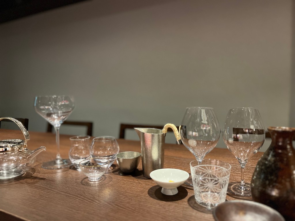 様々な酒器をご用意しております。ワイングラス、純米酒グラス、錫、銅、丹波焼、備前焼など。お酒に合わせて、酒器を選び、サービスいたします。