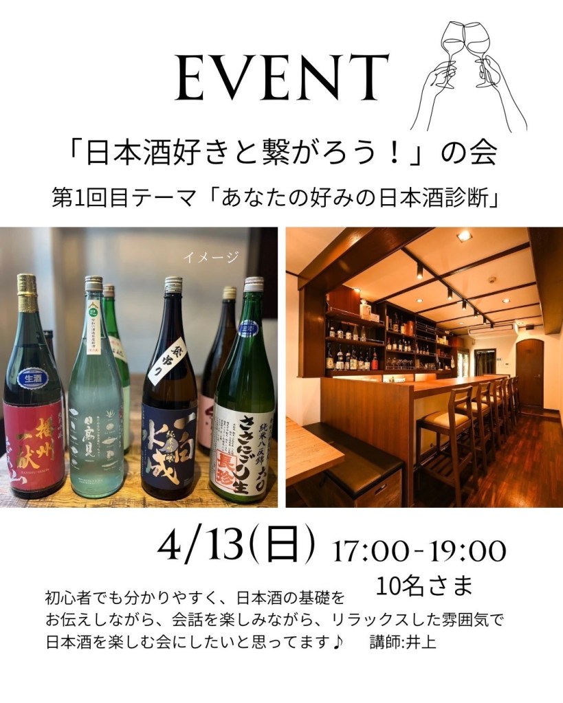 参加される皆様同士の好みの日本酒の話を楽しみ、リラックスした雰囲気で日本酒を楽しむ会にしたいと思ってます。